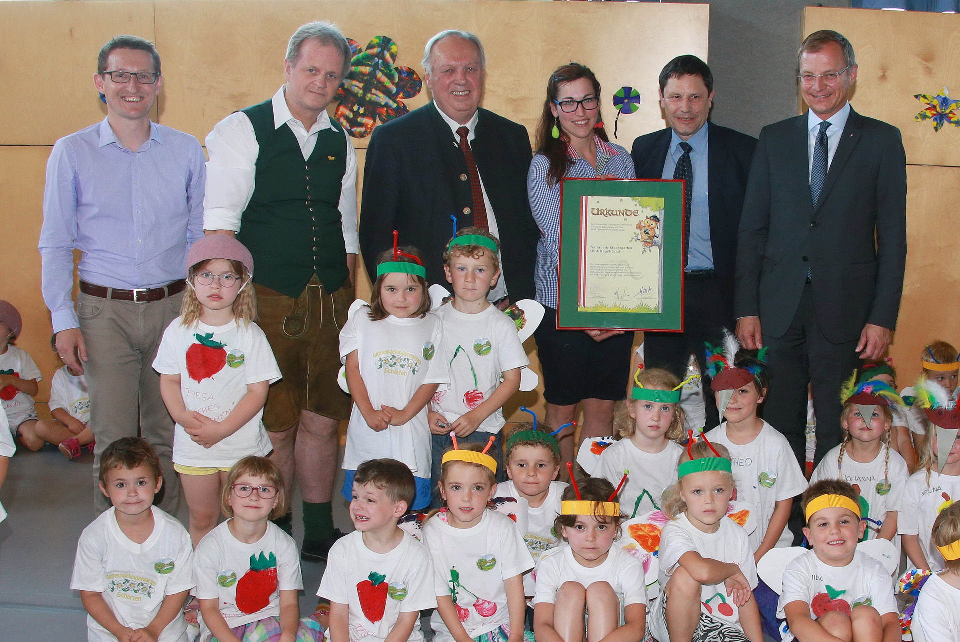 Bild 2: DI Rainer Silber, Bgm. Jürgen Höckner, LAbg. DI Dr. Adalbert Cramer, Kindergartenleiterin Carina Furtlehner, GF Franz Handler sowie Landeshauptstellvertreter Mag. Thomas Stelzer freuen sich mit den Kindern über die Auszeichnung.