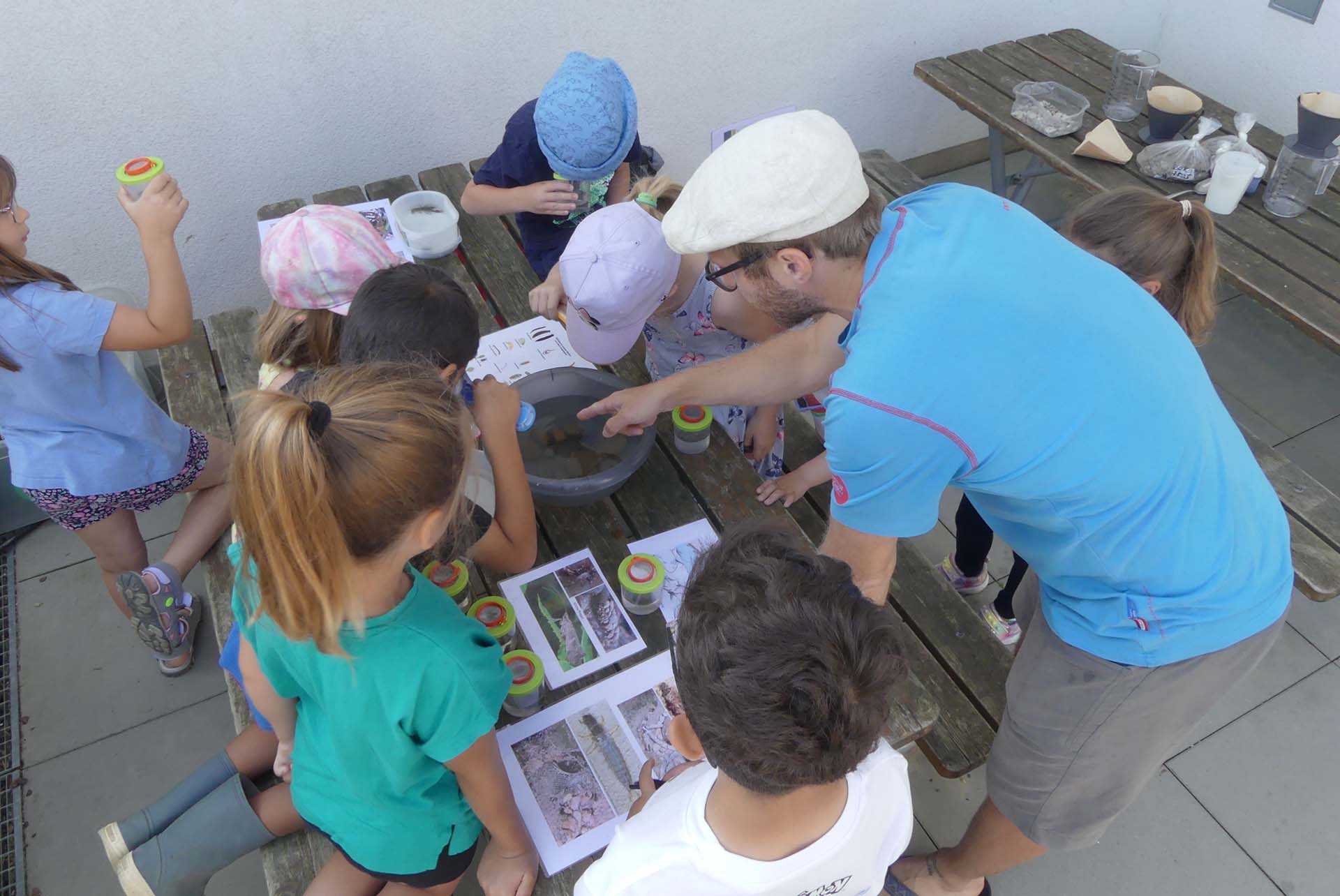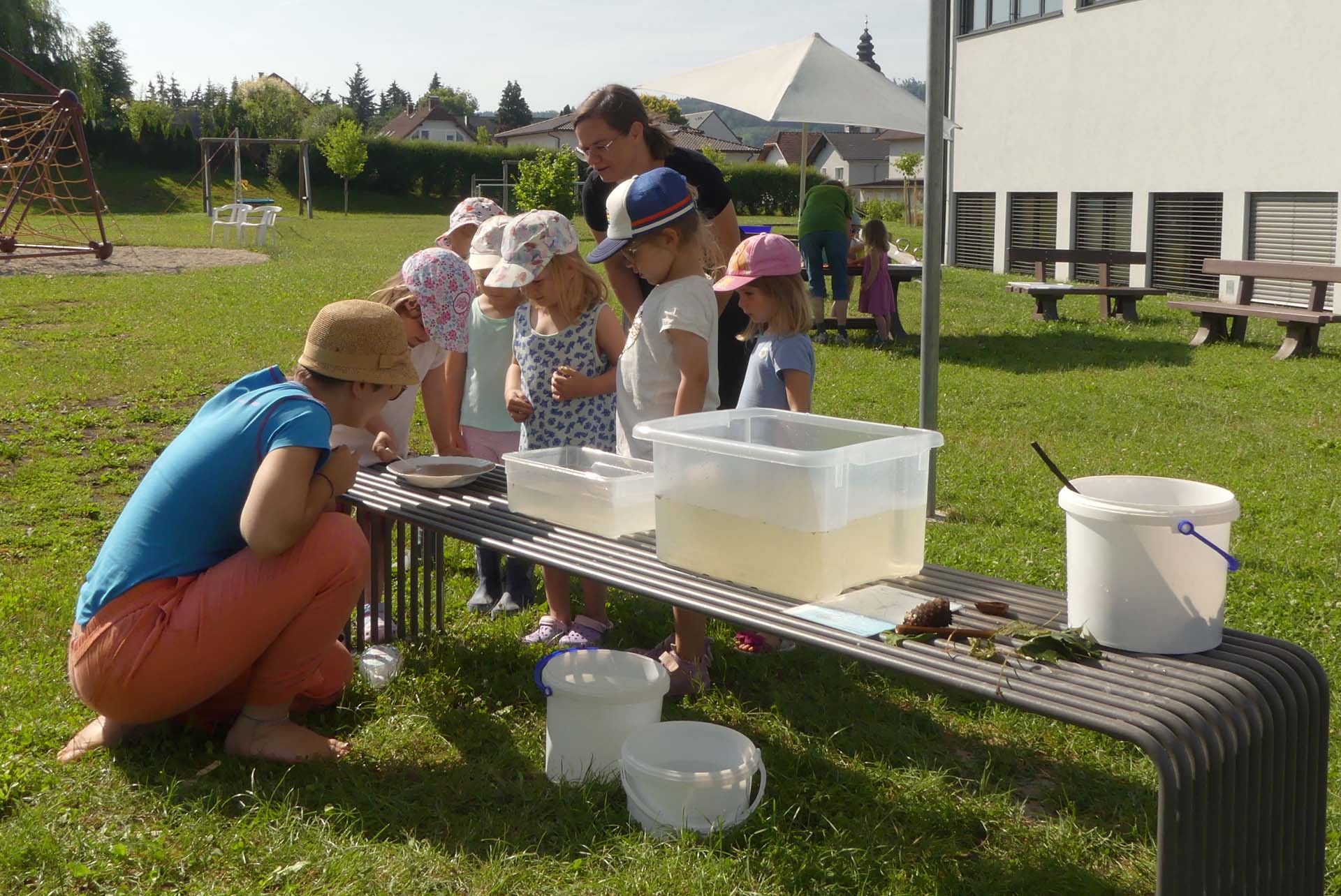 Im Naturpark-Kindergarten St. Marienkirchen/P. wurde ein Stationenbetrieb aufgebaut. So wurden verschiedene Materialen zum Thema “Schwimmen und Sinken” gesammelt und ausprobiert, welche Materialen schwimmen und welche sinken. Dabei wurden bewusst unterschiedlich geformte Gegenstände wie Steine, Holzstücke, Büroklammern, Nussschalen, Pflanzenteile, etc. so gewählt, dass einige sofort untergehen und andere dank ihrer Form oder ihres Gewichts auf der Oberfläche bleiben, um so den Einstieg in das Thema Oberflächenspannung zu ermöglichen. Bei einer weiteren Station wurden Wasserlebewesen, die vorab in der Polsenz gesammelt wurden, bestimmt und deren Lebensweise erörtert. Darüber hinaus wurden auch ein Experiment “Bodenfilter” durchgeführt, welches die Zusammenhänge zwischen den Bodenfunktionen (Wasserfilter, Wasserspeicher, Hochwasserschutz, etc.) auf kindgerechte Weise vermittelte.
