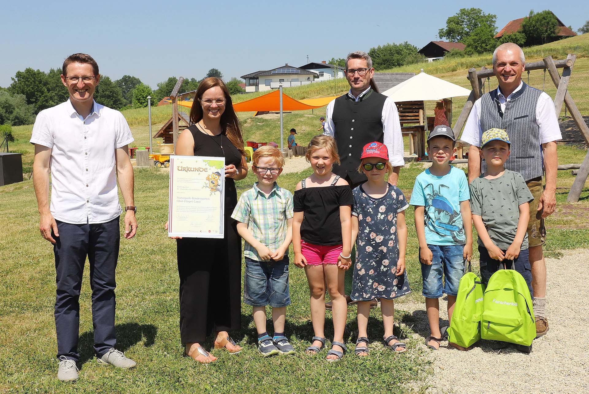 Johann Thauerböck, der die Urkunden an Direktorin Gloria Götzenberger sowie Kindergartenleiterin Daniela Stadler überreichte, freute sich, dass Zertifizierungen nach einer längeren Pause endlich wieder möglich sind. „Sinn und Auftrag der Naturparke ist der Erhalt der Kulturlandschaften. Rund 500.000 Menschen wohnen in Österreich in Naturparken, nur mit ihrer Unterstützung kann dies gelingen.“, so sein Resümee. Eine besonders wichtige Zielgruppe seien die Kinder, weil man zum einen nicht früh genug beginnen kann, auf das Prinzip „Schützen durch Nützen“ hinzuweisen und weil man durch sie auch die Eltern erreicht. 139 Naturpark-Schulen und 60 Naturpark-Kindergärten und -Horte gibt es derzeit in Österreich, im Naturpark Obst-Hügel-Land sind jetzt beide Volksschulen und Kindergärten zertifiziert.