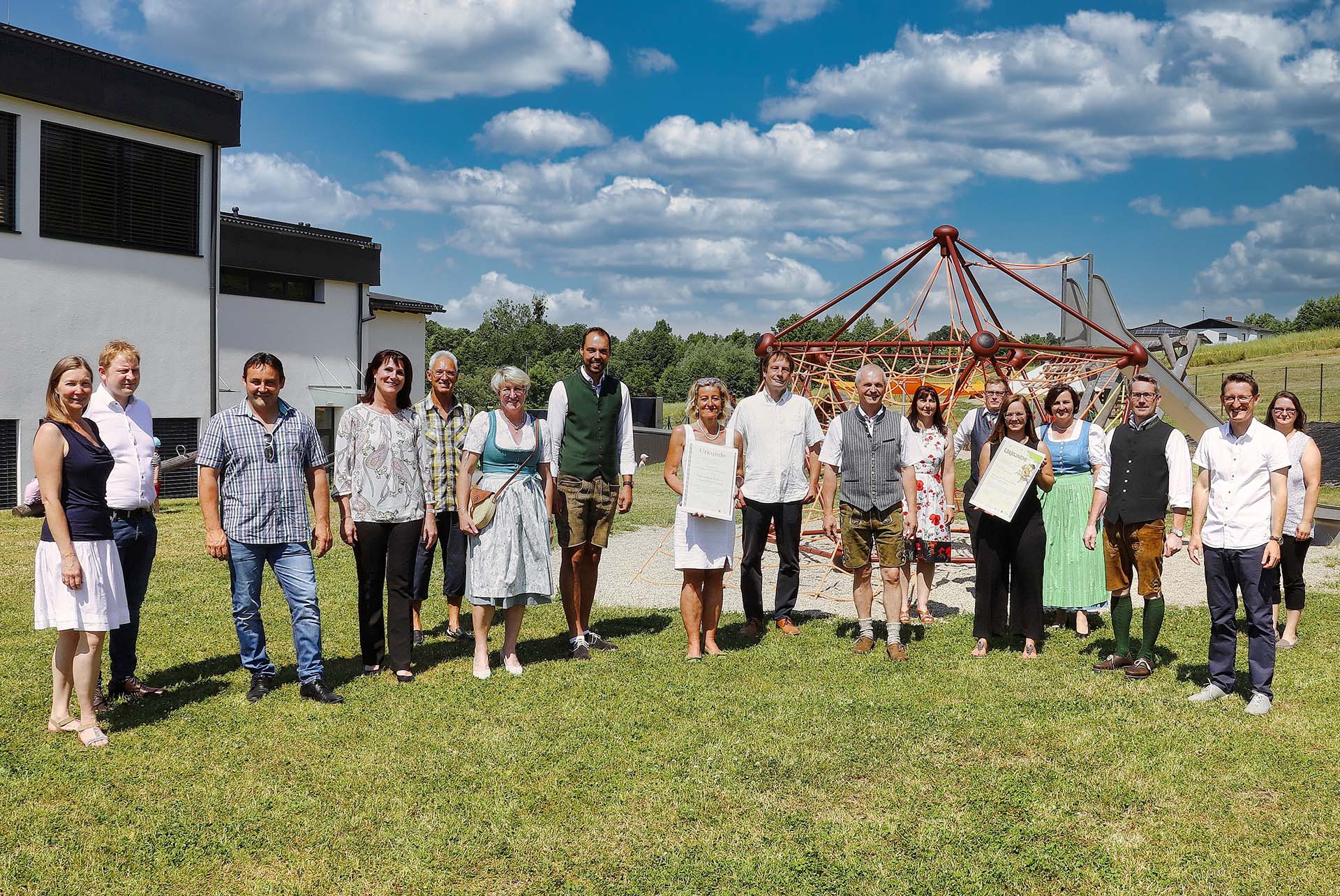 Das gemeinsame Gebäude des Kindergartens und der Volksschule St. Marienkirchen/Polsenz wurde in den letzten Jahren generalsaniert. Im Frühjahr 2020 konnten die neuen Räumlichkeiten bezogen werden. Das für Juni 2020 geplante Eröffnungsfest (inkl. Prädikatsverleihung Naturpark-Schule und Naturpark-Kindergarten) wurde coronabedingt zunächst auf Juni 2021 verlegt. Aufgrund der Situation im Frühling 2021 war jedoch auch heuer keine größere Feier möglich und so verlieh Johann Thauerböck, Präsident des Verbandes der Naturparke Österreichs die Urkunden am Freitag, den 18. Juni in einem kleinen, aber feierlichen Rahmen. Bürgermeister Harald Grubmair freut sich über die gelungene Generalsanierung von Volksschule und Kindergarten, in seiner Ansprache zeigte er sich stolz über die gelungene Gebäudesanierung mit den offenen Lernlandschaften und dankte den PädagogInnen und dem Naturpark-Team, die mit viel Engagement den Kindern das Bewusstsein für eine intakte Natur vermitteln.