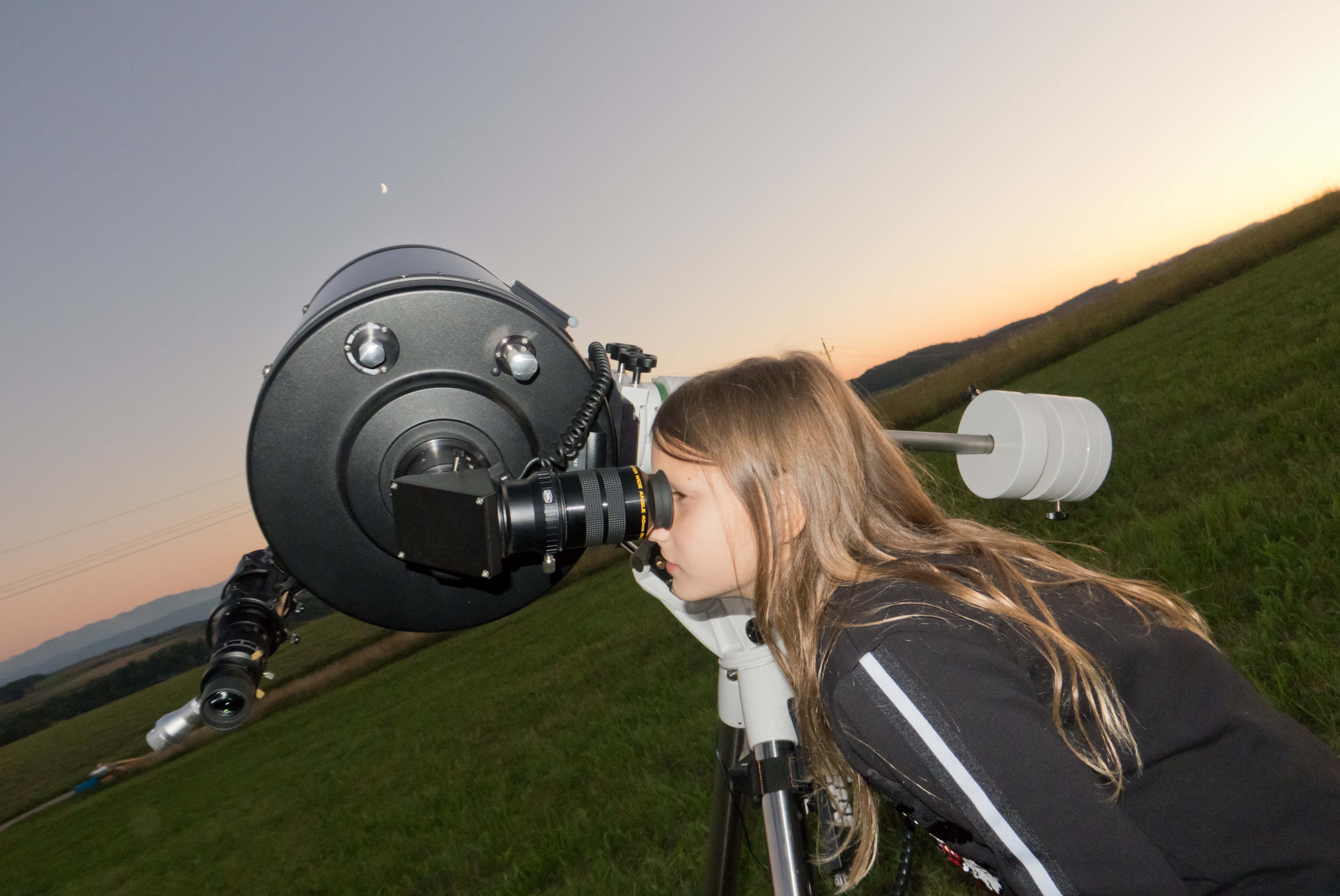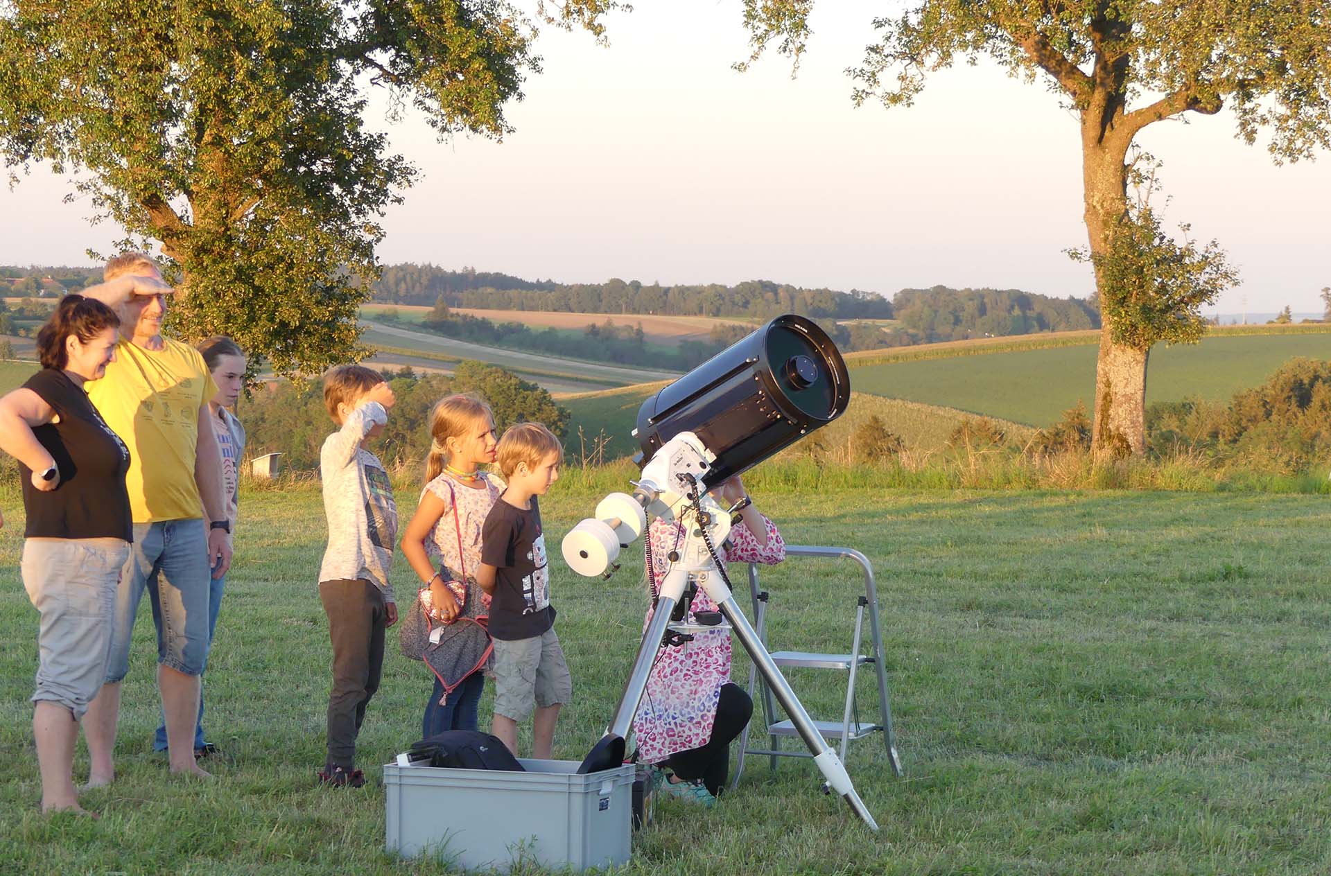Wir lernen das Planetenmodell mit den 8 Planeten kennen und können verschiedene Sternbilder entdecken. Mit dem Fernrohr beobachten wir neben den Planeten auch den Mond.