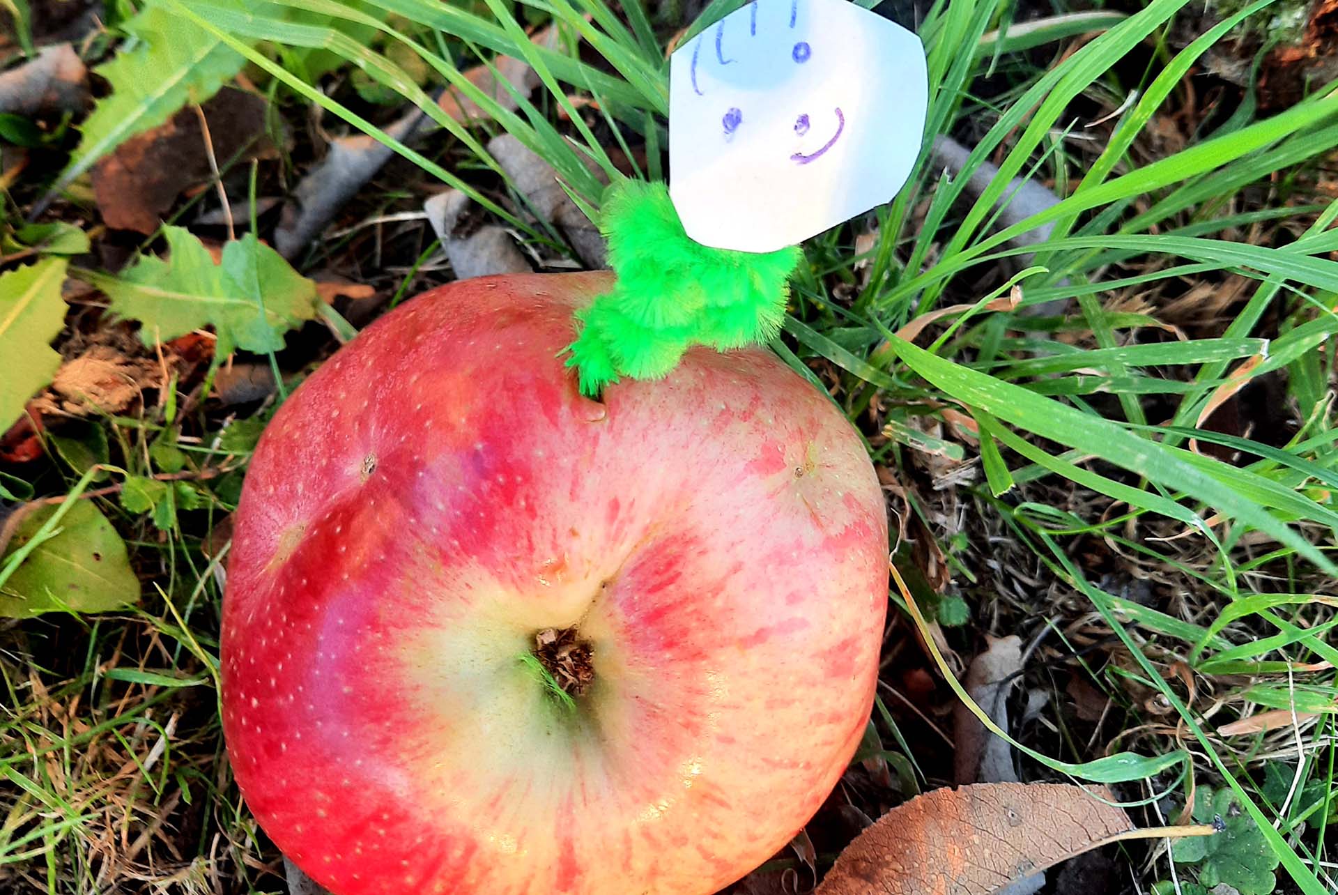 Danach bereiten wir drinnen köstliche Bratäpfel zu. Während sie im Ofen brutzeln und sich ihr Duft verbreitet, erzählen wir uns lustige Apfel-Geschichten mit dem Erzähltheater.