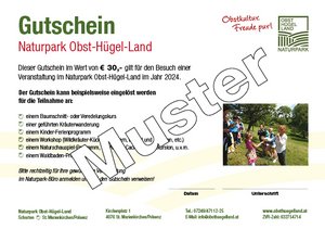 Naturschauspiel-GutscheinPassend für viele Gelegenheiten, praktisch und ein besonderes Geschenk sind die Wertgutscheine von Naturschauspiel. Der Betrag ist frei wählbar und der Gutschein kann bei jeder der insgesamt 130 Touren - selbstverständlich auch im Naturpark Obst-Hügel-Land - eingelöst werden. Restbeträge werden vom Guide bar ausbezahlt. |