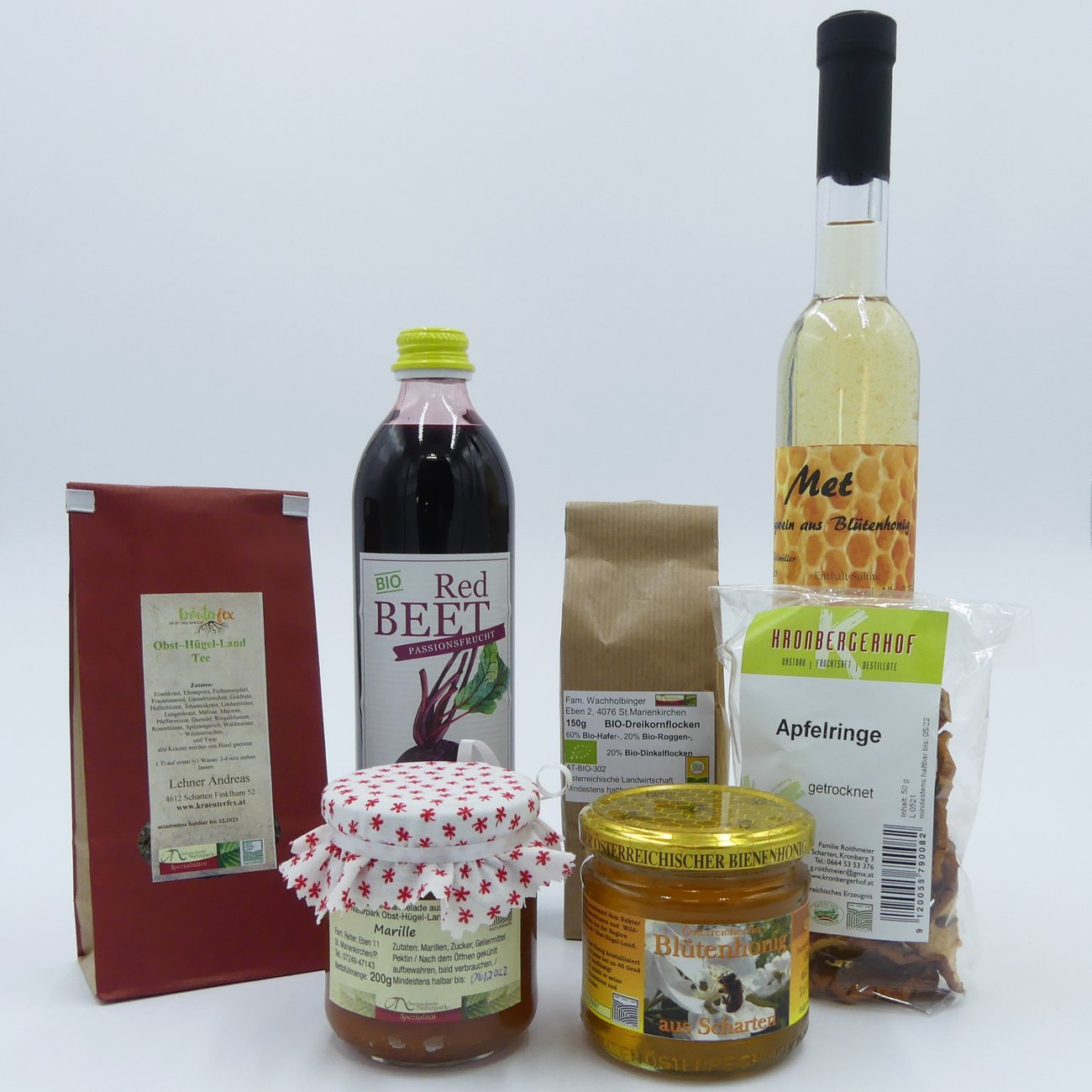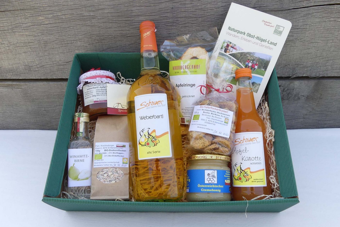 Regionale Produkte sind im Trend und mit Naturpark-Spezialitäten kann man zu jeder Zeit Freude bereiten! Unsere Geschenkpakete und -körbe beinhalten bäuerliche Erzeugnisse aus den beiden Naturpark-Gemeinden Scharten und St. Marienkirchen/Polsenz. Durch den Erwerb von Naturparkprodukten unterstützen Sie die landwirtschaftlichen Betriebe, damit diese den Reichtum und die Vielfalt der Kulturlandschaft im Obst-Hügel-Land auch weiterhin sichern können. Darüber hinaus tragen Sie mit regionalen Geschenken zum Klimaschutz bei!