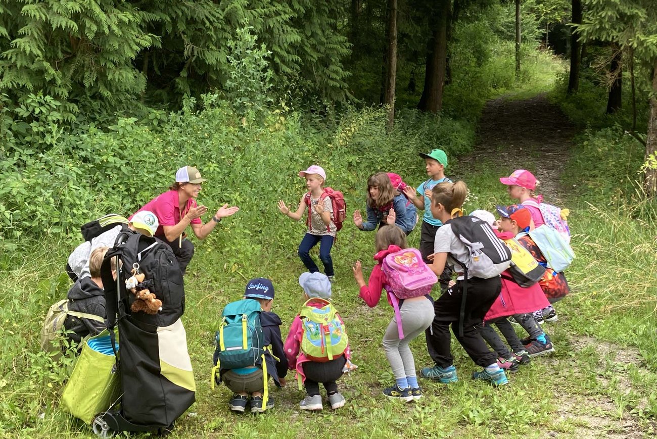 Mit einem Liedchen begrüßen wir den Wald, danach widmen wir uns einer vielfältigen Mischung aus altersgerechtem Wissen und Spielen: Von den verschiedenen Blättern, Nadeln und Bockerln bis hin zu den Tierspuren der vielen Waldbewohner.