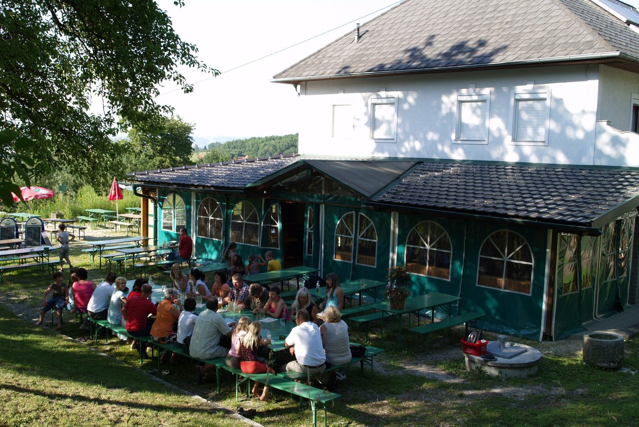 Genießen Sie in unserem großen, schattigen Gastgarten den herrlichen Blick übers Donautal.