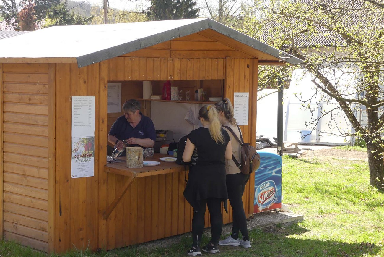 An der Labestation werden die Wanderer mit Schartner Säften, besten österreichischen Weinen und Frizzante, Schartner Most, Bier, Kaffee, Mehlspeisen, Eis und belegten Broten verwöhnt.